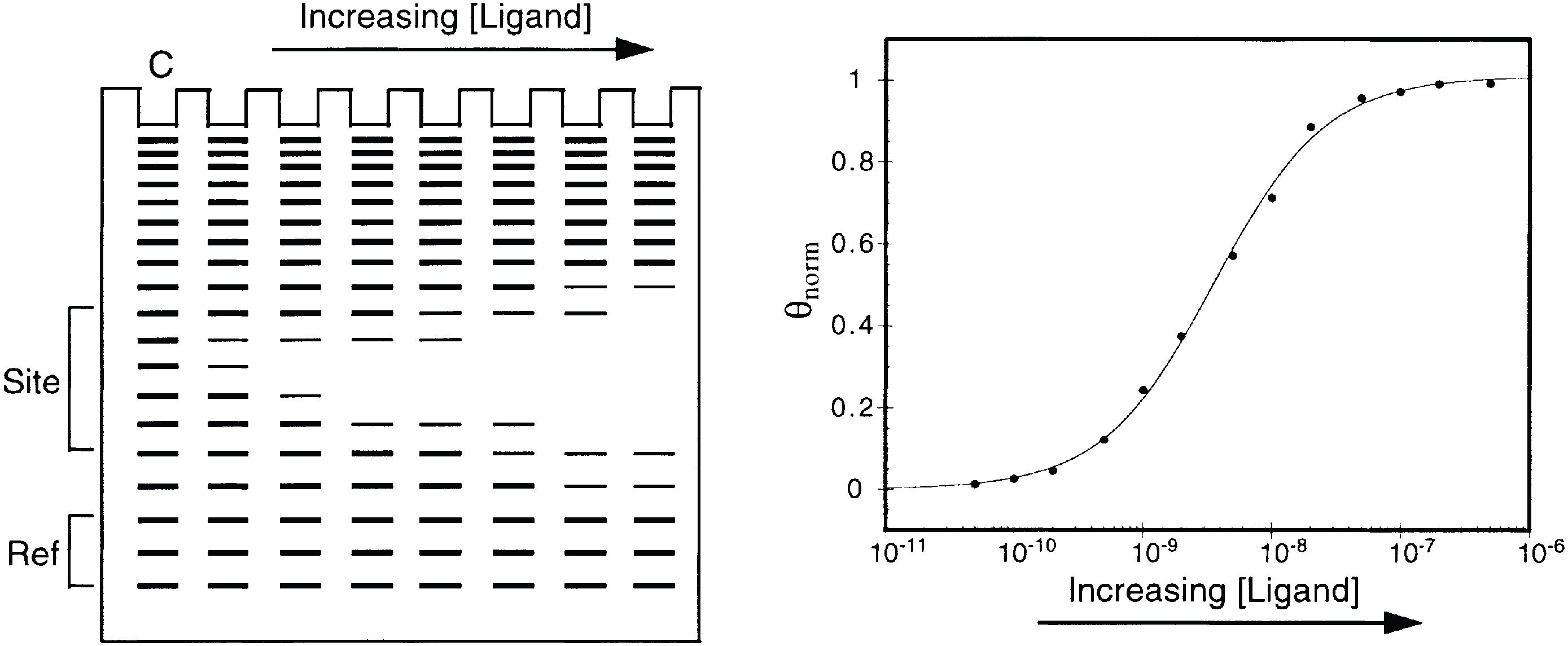 Quantitative footprinting titration analyses.(left)Cleavage pattern generated by quantitative DNase I footprinting titration on a 3'-labeled DNA fragment in the presence of increasing ligand concentration (right). Langmuir binding titration isotherm obtained from DNase I data.